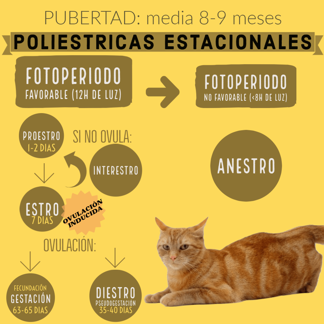 El estro es el periodo de receptividad sexual con una duración promedio de 7 días (3-16) y luego desaparece durante un término medio de 9 días (3-14). La duración del estro no se ve afectada por la monta o ovulación. Si la gata no es cubierta o no es estimulada para ovular, el estro ocurrirá cada 2 o 3 semanas bajo un fotoperiodo apropiado. Si la gata ovula, se forman cuerpos lúteos, los cuales secretan progesterona. Si la gata no está preñada, se produce el diestro (pseudogestación), con una duración de 35 a 40 días. El anestro es el periodo estacional en el que la gata no cicla. La aparición del anestro puede verse alterada por la influencia de iluminación artificial.